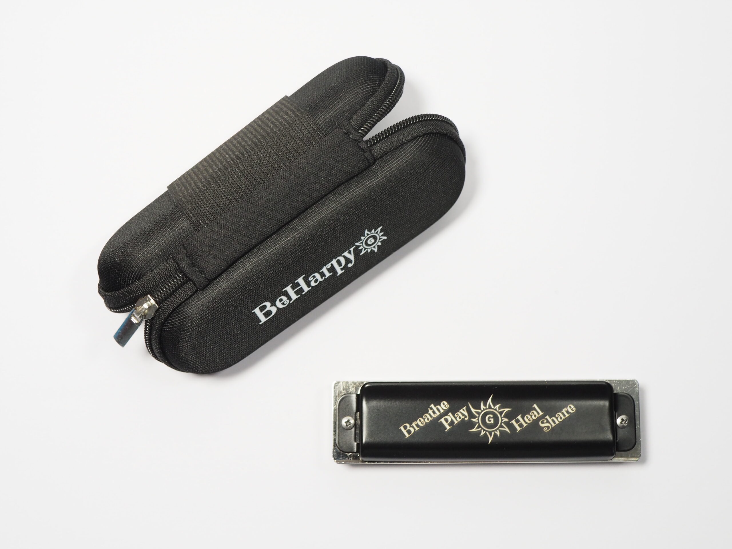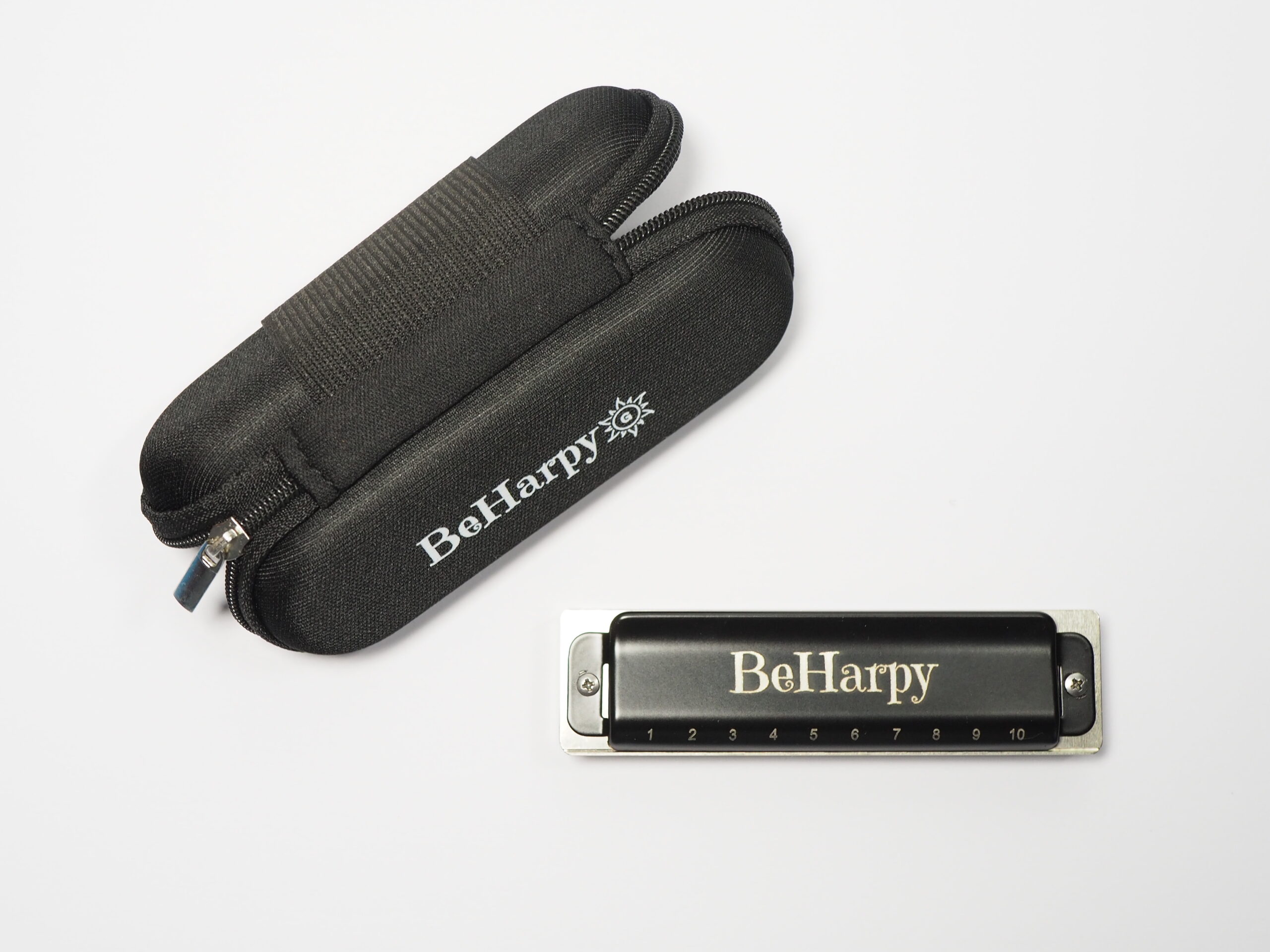 Harmònica diatònica professional BeHarpy personalitzada de color negre, Easttop T008K de 10 forats, cos d’ABS, llengüetes de llautó, en tonalitat de sol, amb funda de cremallera BeHarpy.